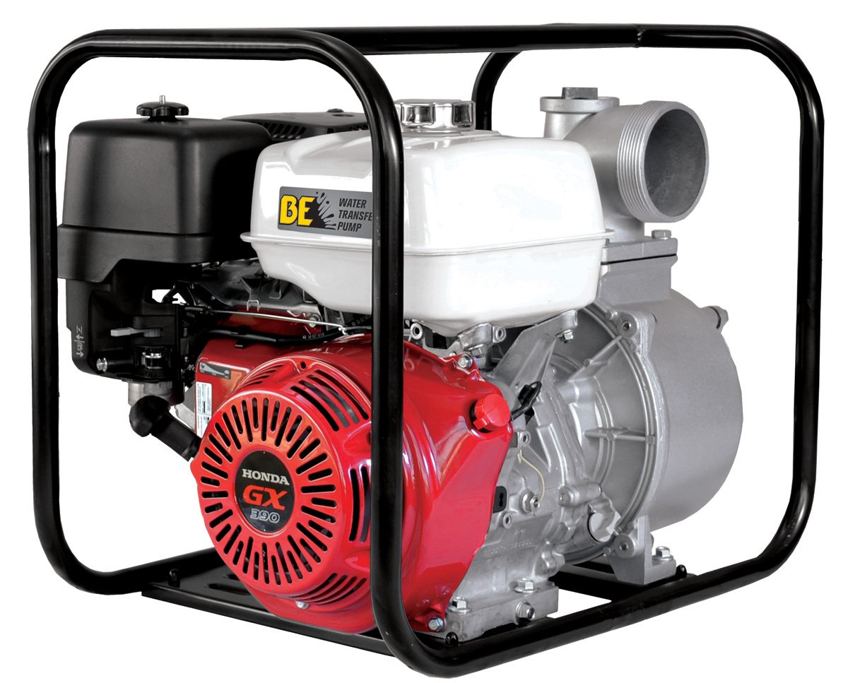 BE Pressure WP-4013HR Water Transfer Pump 4", GX390, 422 GPM, 13 HP. Features include Centrifugal Aluminum Pump, Heavy Duty Cast Iron Impeller, 98' Total Lift, and 26' Suction Lift.