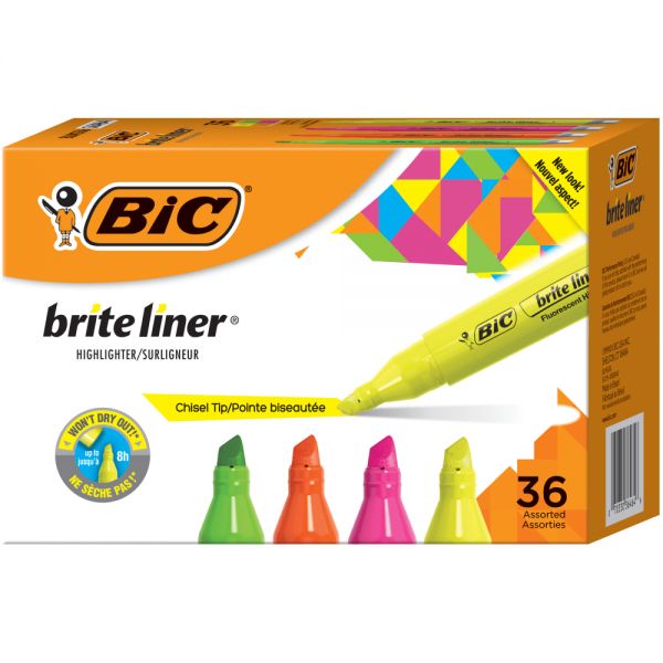 BIC Brite Liner Highlighter, Tank style, Chisel Tip, Box of 36 Assorted Fluorescent Highlighters