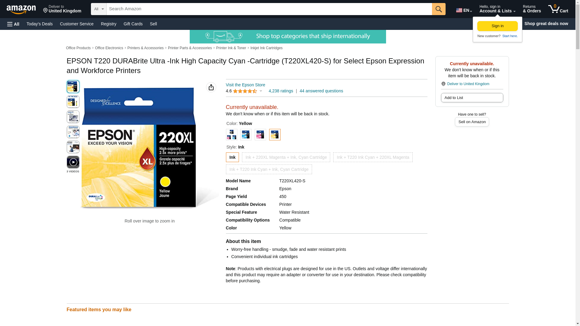 EPSON 220 DURABrite Ultra Ink High Capacity Yellow Cartridge (T220XL420-S) Works with WorkForce WF-2630, WF-2650, WF-2660, WF-2750, WF-2760, Expression XP-320, XP-420, XP-424