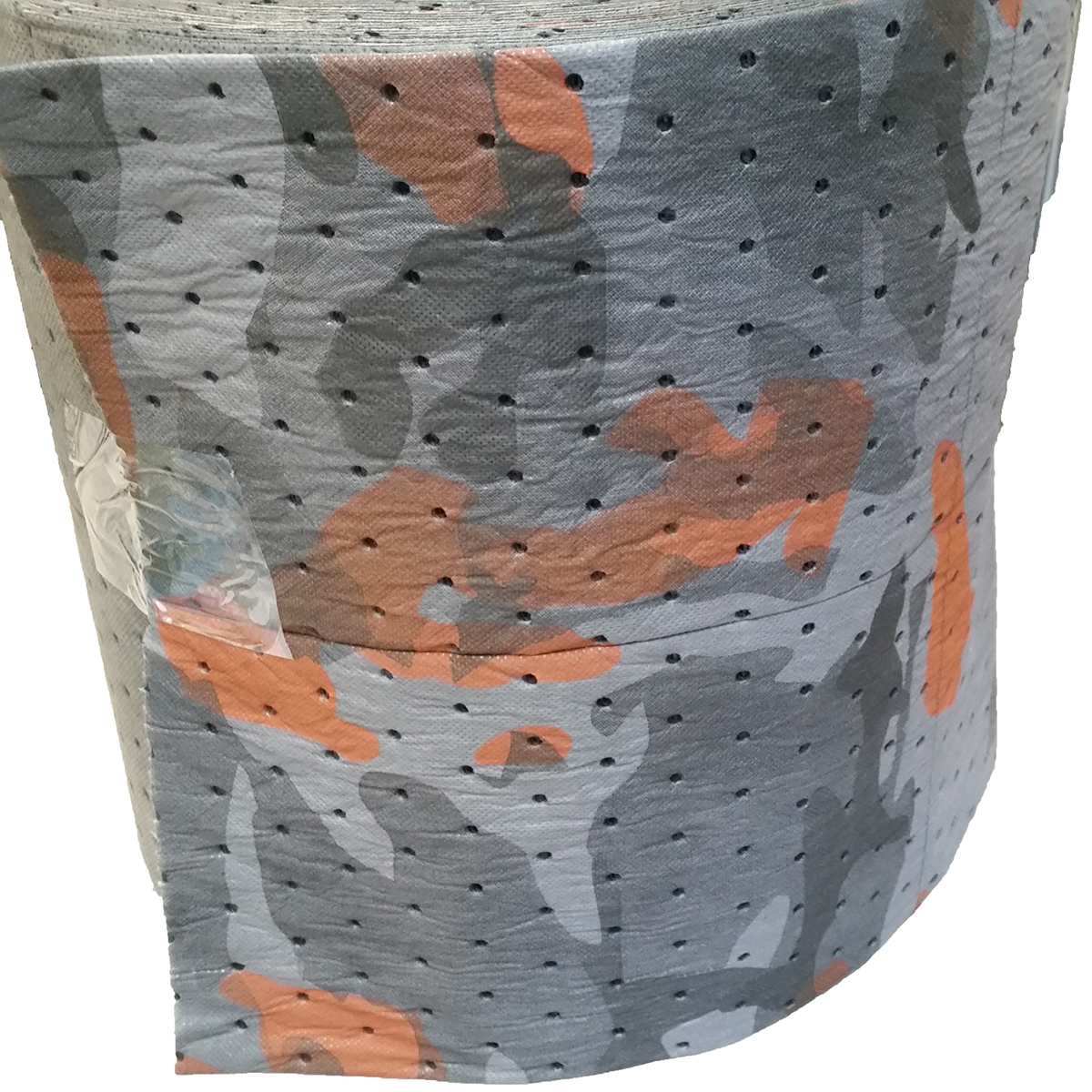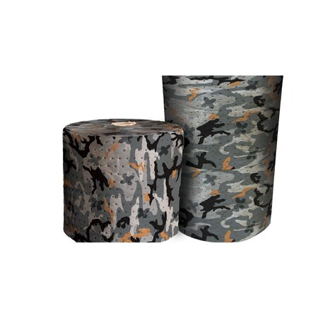 - Camouflage universal absorbent rolls absorb most non-aggressive fluids, which includes oil (hydrocarbon-based fluids), water, glycols, etc. These rolls are rolled out in walkways for absorption of overspray and accident prevention. The camouflage pattern hides saturated areas.