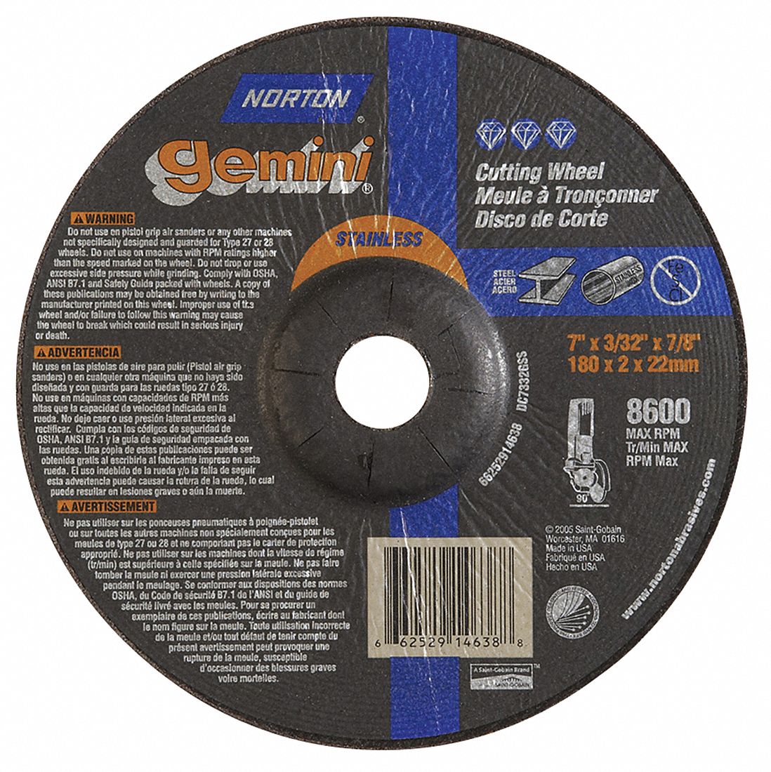 ' Depressed Center Wheel, Type Type 27, Wheel Type Cutting, Diameter 7 In., Thickness 3/32 In., Arbor Size 7/8 In., Abrasive Material Aluminum Oxide, Grit 24, Grade Extra Coarse, Max. RPM 8600, Series Gemini Stainless Steel, Application Ferrous Metal, Gray Iron, Stainless, Contaminate Free '