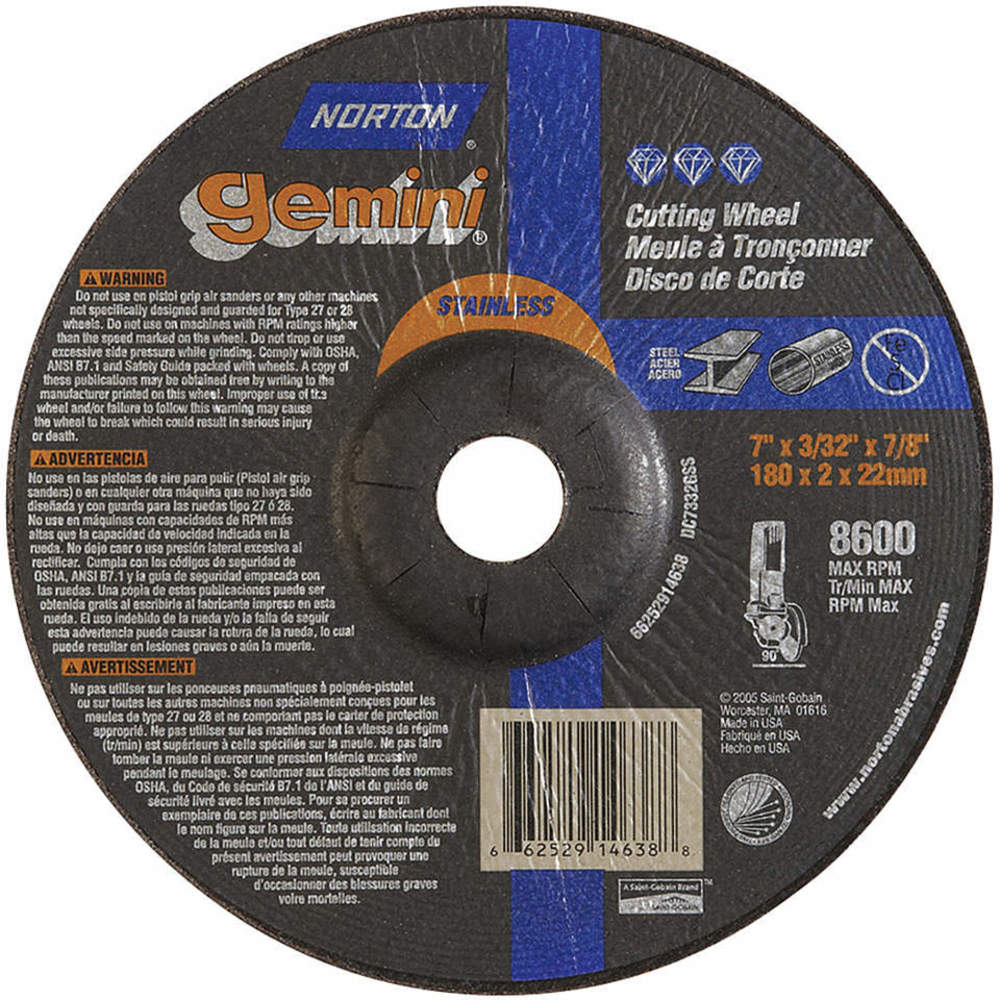 The NORTON Type 27 general-purpose grinding and cutting wheel has an aluminum oxide abrasive for cutting ferrous metals, gray iron, and stainless steel.<br /><br /> Item: Depressed Center Wheels<br /> Abrasive Wheel Type: Type 27<br /> Abrasive Wheel Diameter: 7"<br /> Thickness: 3/32"<br /> Arbor Hole Size: 7/8"<br /> Abrasive Material: Aluminum Oxide<br /> Abrasive Grit: 24<br /> Max. RPM: 8600<br /> Series: Gemini Stainless Steel<br /> Grade: Extra Coarse<br /> Application: Ferrous Metal, Gray Iron, Stainless, Contaminate Free<br />