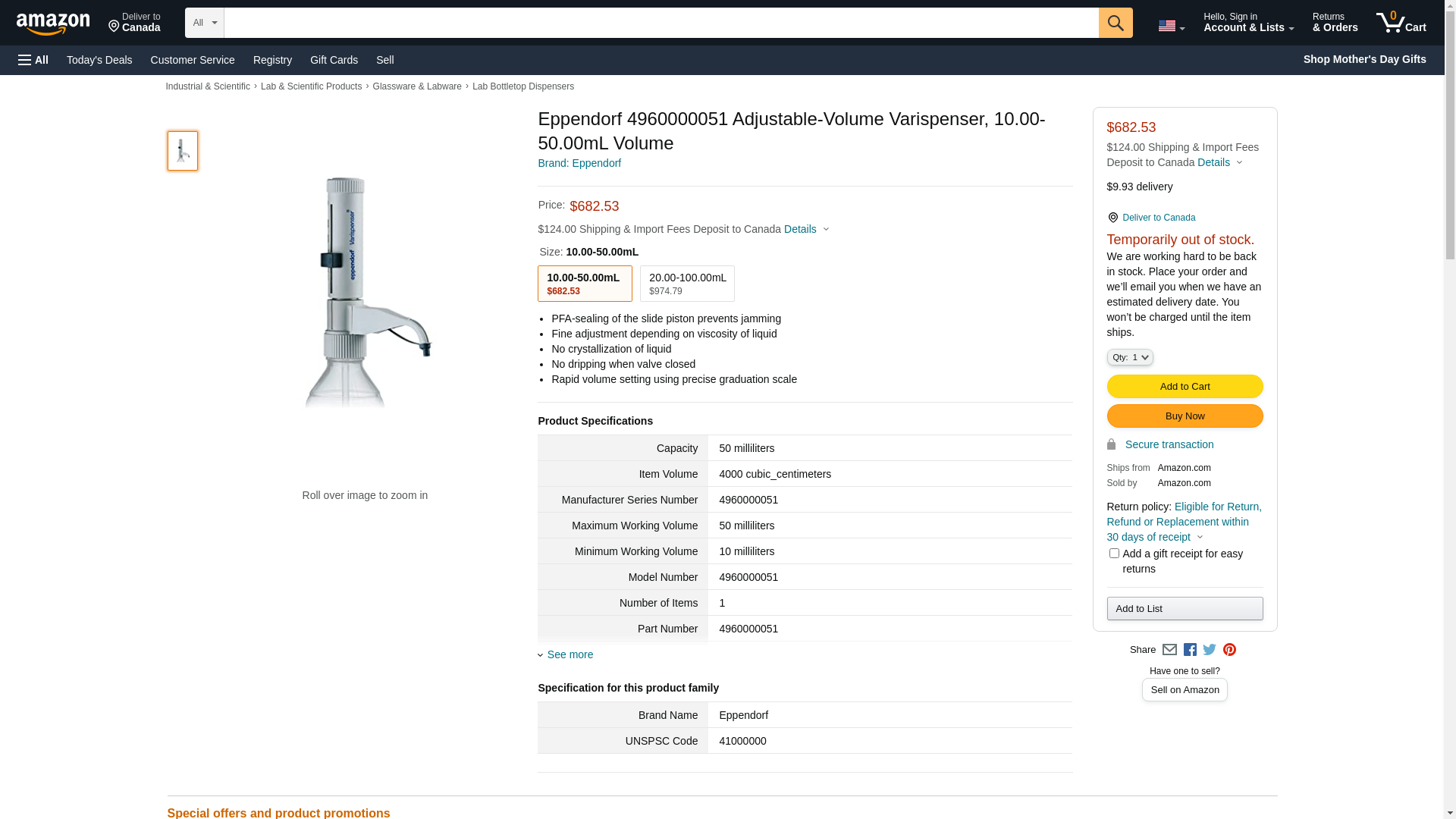 Eppendorf 4960000051 Adjustable-Volume Varispenser, 10.00-50.00mL Volume