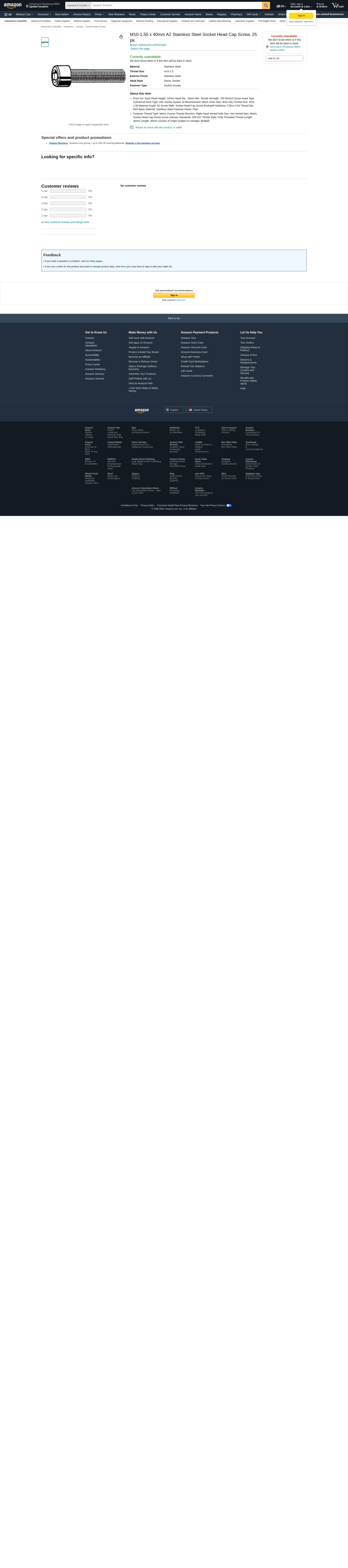 M10-1.50 x 40mm A2 Stainless Steel Socket Head Cap Screw, 25 pk.