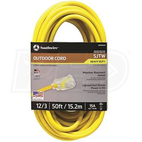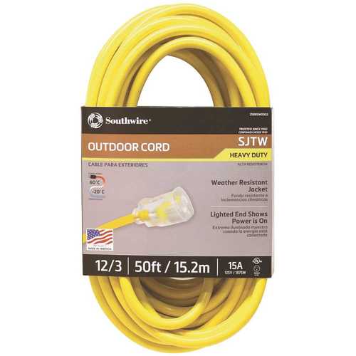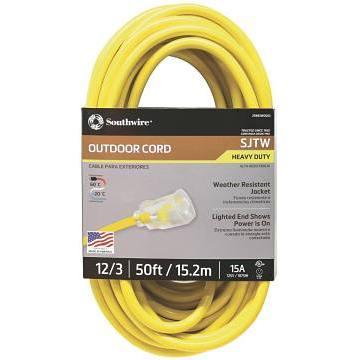 Southwire 2588SW0002 Outdoor Cord-12/3 SJTW Heavy Duty 3 Prong Extension Cord-for Commercial Use (50', Yellow), 50 Feet