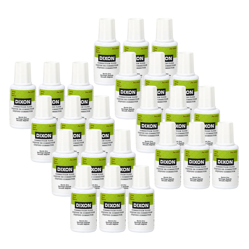 Dixon Correction Fluid provides superior coverage of most inks. Fluid is applied with a synthetic brush and dries quickly. Fluid requires no thinning. The non-toxic, white formula can be used at home, school or office. Each bottle contains 20 ml/.7 oz. Sold as a pack of 24 bottles.