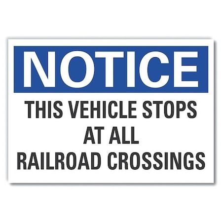 Notice Sign, Vertical Rectangle, Number of Printed Sides 1, English, Sign Format Traditional OSHA, Sign Legend This Vehicle Stops At All Railroad Crossings, Sign Legend Background Color White, Sign Legend Style Text