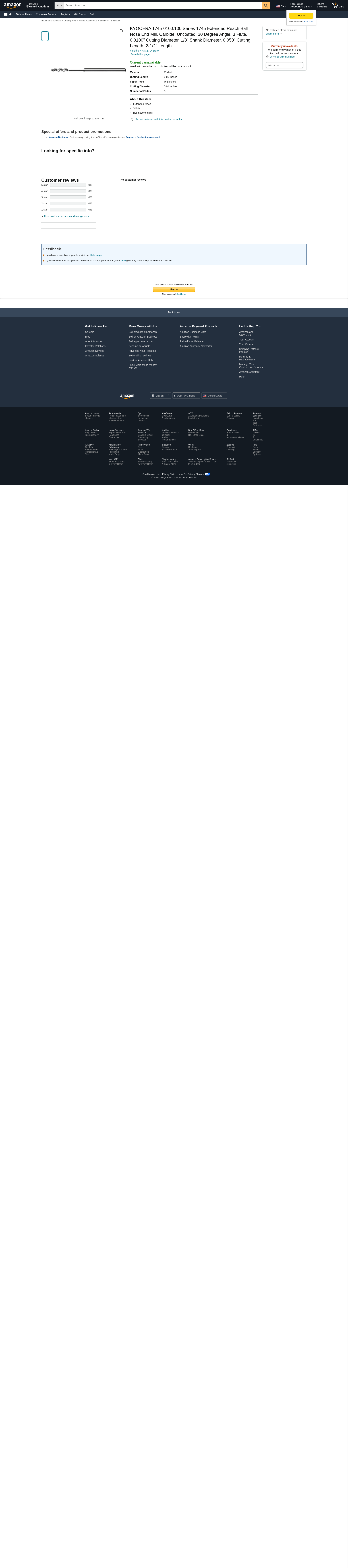 Kyocera 1745-0100.100, 3 Flute Extended Reach Ball Nose End Mill
