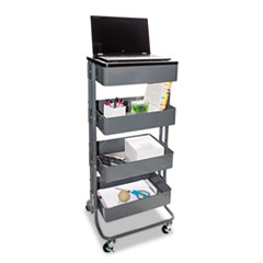 Heavy-duty, metal construction with a removable MDF top tray. Center two baskets are adjustable in height. Can be configured with four bins as a standing laptop station, three bins for deskside storage, or two bins for underdesk use. Rolls smoothly on four casters, two locking. Color: Gray; Capacity (Weight): 50 lbs.; Caster/Glide/Wheel: Four Casters (2 Locking); Material(s): MDF; Metal.