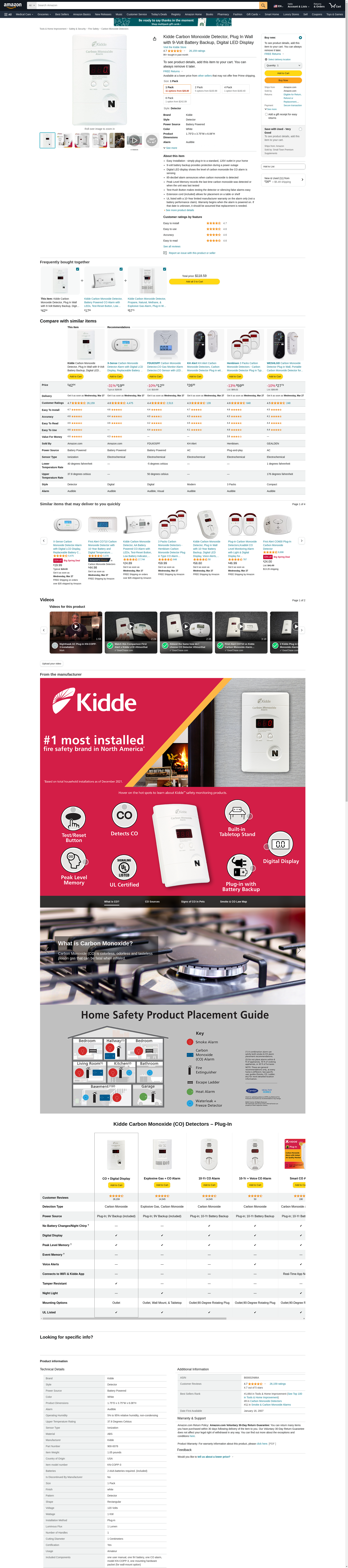KIDDE 900-0076-01 Kidde Plug in Carbon Monoxide Detector with Digital Display and 9V Battery Back Up, Plastic, 11" x 2" x 7.5"