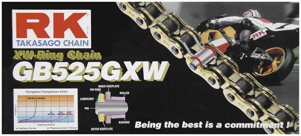 <ul> <li>RK GB525GXW-110 GOLD Top of the line chains.</li> <li>High-tech XW-ring seals with three lubrication barriers protect against high-speed abrasion, heat build-up, torsional flex and loss of lubricant - even under extreme conditions.</li> <li>GXW chains last up to 10x longer compared to standard chains.</li> <li>Available in natural, gold or gold/black finish.</li> <li>Suitable for 1300cc max street/800cc offroad use.</li> <li>Average tensile strength of 8,900 lbs.</li> </ul>