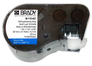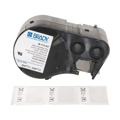 Brady - 143267 M-115-427 Vinyl B-427 Black on White/Clear Label Maker Cartridge, 1-1/4" Width x 1-1/2" Height, For BMP51/BMP53 Printers