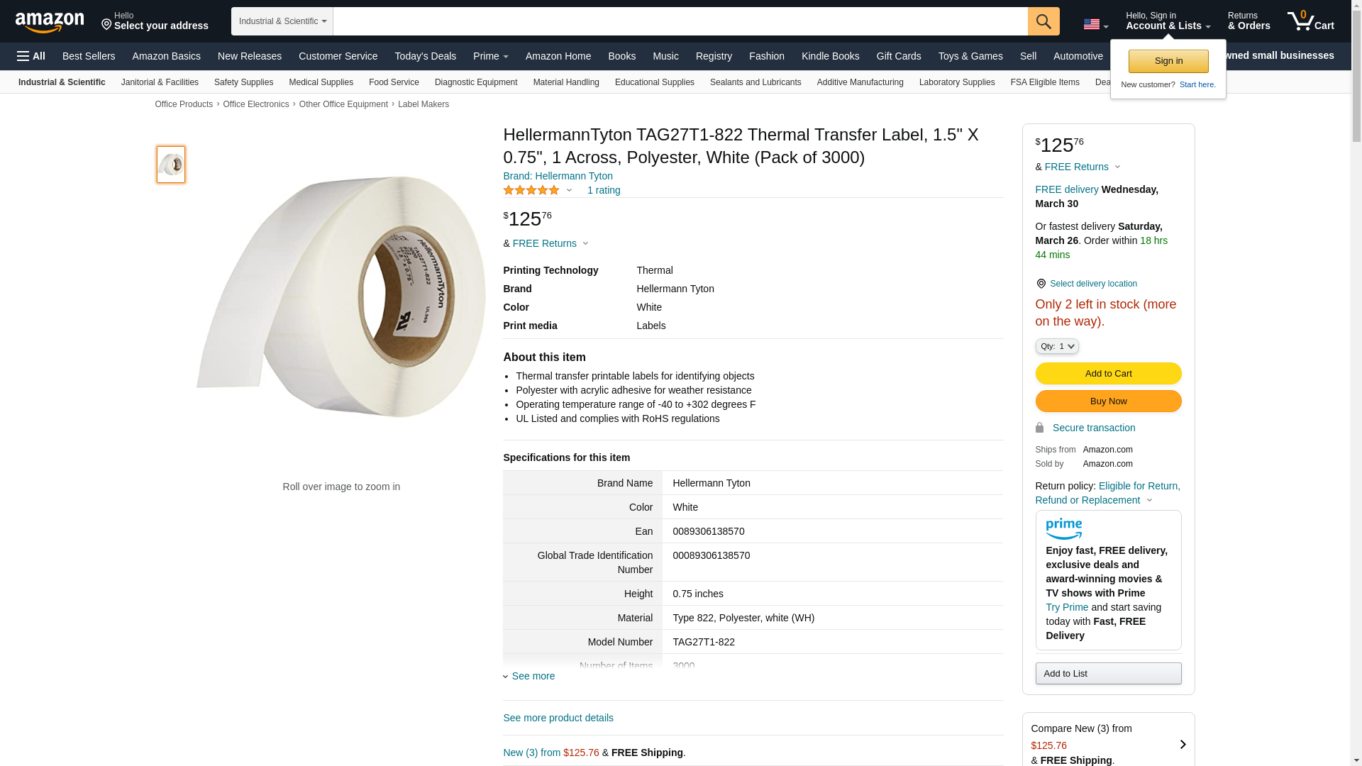 HellermannTyton TAG27T1-822 Thermal Transfer Label, 1.5" X 0.75", 1 Across, Polyester, White (Pack of 3000)