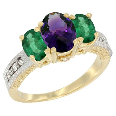 10K Yellow Gold Diamond Natural Amethyst Ring Oval 3-stone with Emerald, sizes 5 - 10