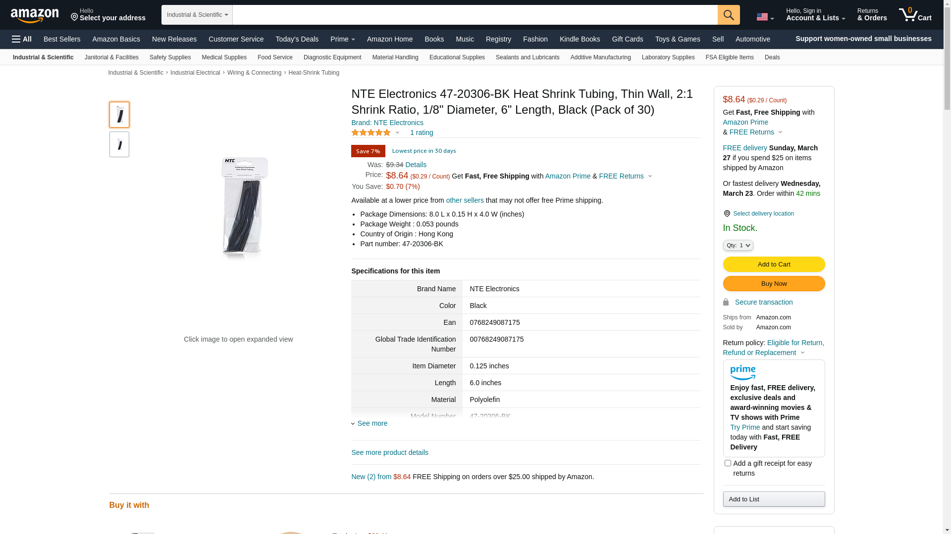 NTE Electronics 47-20306-BK Heat Shrink Tubing, Thin Wall, 2:1 Shrink Ratio, 1/8" Diameter, 6" Length, Black (Pack of 30)