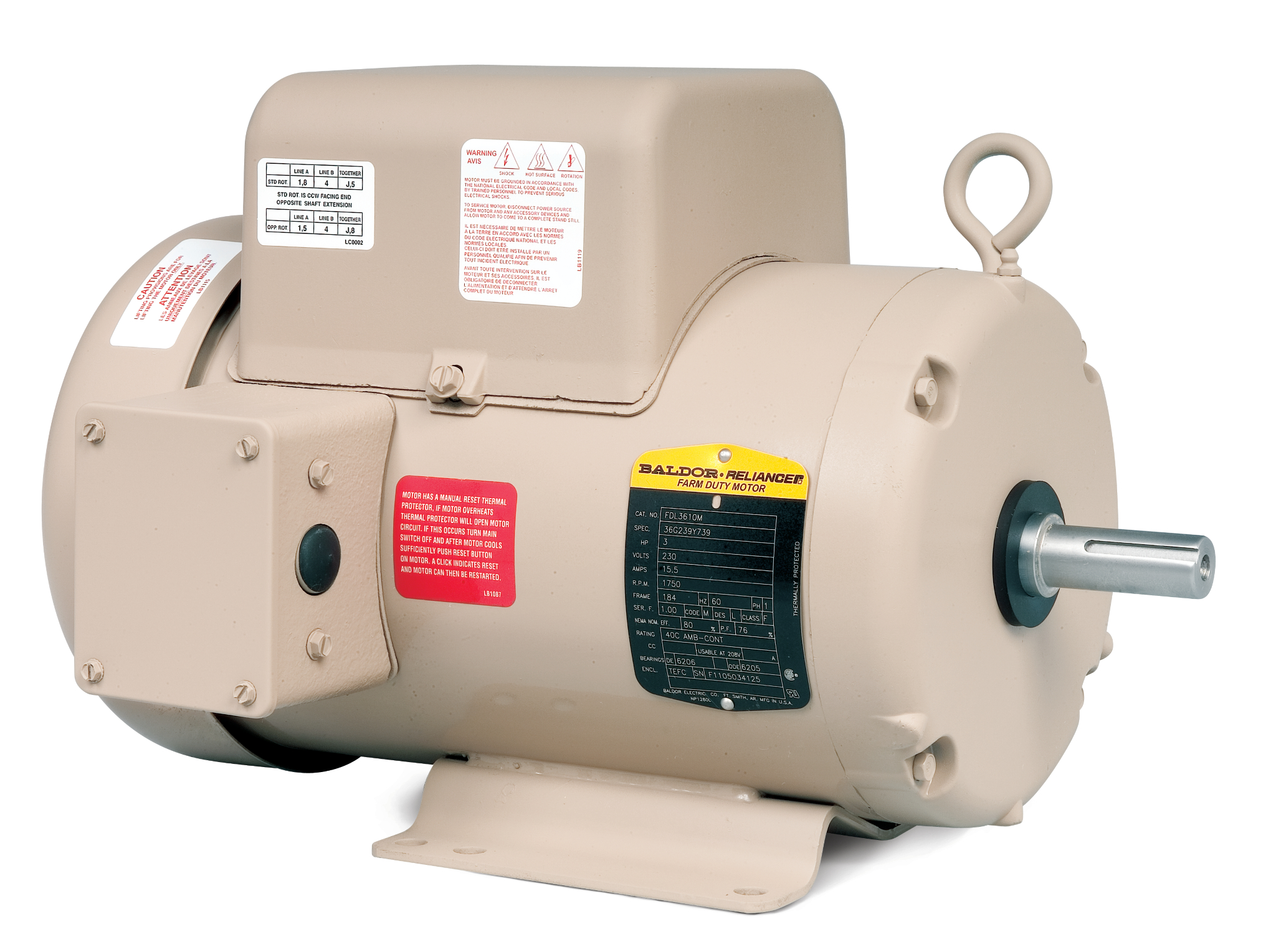 The farm-duty Baldor--3HP, 1750RPM, 1PH, 60HZ, 184T, 3640LC, TEFC, F1, AC Motor has the features to run your key industrial and farm equipment. You can use this motor to power auger drives, metering pumps, irrigation tower drives, grain stirrers and crop driers. Baldor's 3 hp motor includes Mobil Polyrex EM premium grease to withstand increased wear and tear. Its motor is completely enclosed and fan cooled (TEFC) for maintenance-free operation. The single-phase motor also features condensation drains to prevent moisture buildup. Baldor's AC motor has ball bearing construction for longer motor life and dependability. Heavy farm-duty epoxy coating protects the Baldor motor from external elements and weather.