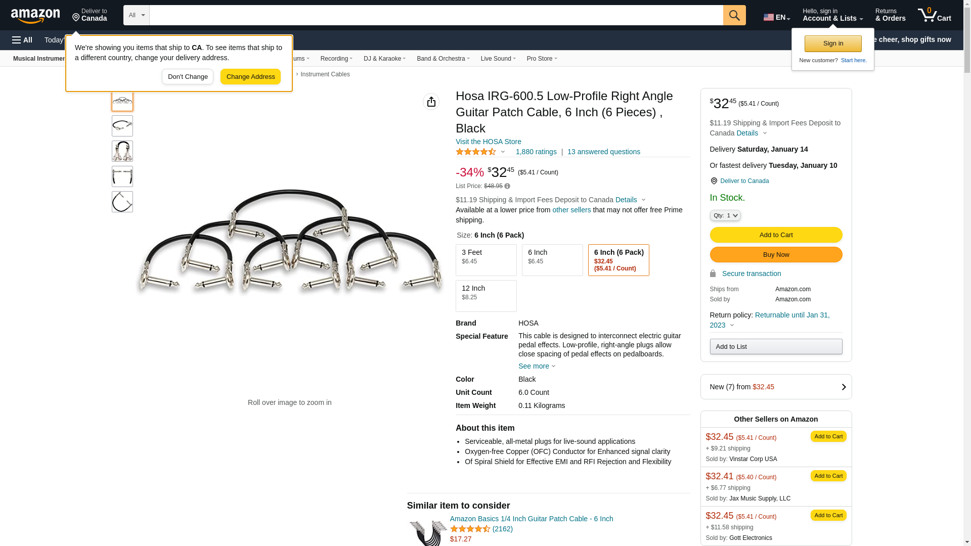 Hosa Guitar Patch Cable, Low-Profile Right-Angle To Same, 6 In, 6 Pc - IRG-600.5