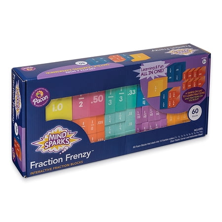 Break apart the blocks and quickly learn how to build up fractions to equal a whole. An engaging introduction to spatial relations. Makes solving division equations with fractions easy. Includes 60 blocks that stack into 10 fraction cubes and a box for storage and travel. Whether you are learning in the classroom or at home, Fraction Frenzy is a visual and hands-on way to understand the basics of fractions. With 60 pieces total, have fun breaking down and creating different fraction blocks with 1?1, 1?2, 1?3, 1?4, 1?5, 1?6, 1?8, 1?9, 1?10, and 1?12 pieces. Stack one fraction together, or combine different fractions to create a whole. Let's start building! Use the 1?1 or whole block as a point of reference. Each fraction compiles into a 3" x 3" block to make a whole. Stack each fraction in the plastic holder for guidance as you create your whole. For basic learning, have younger children count how many blocks make a whole to figure out the denominator of the fraction.