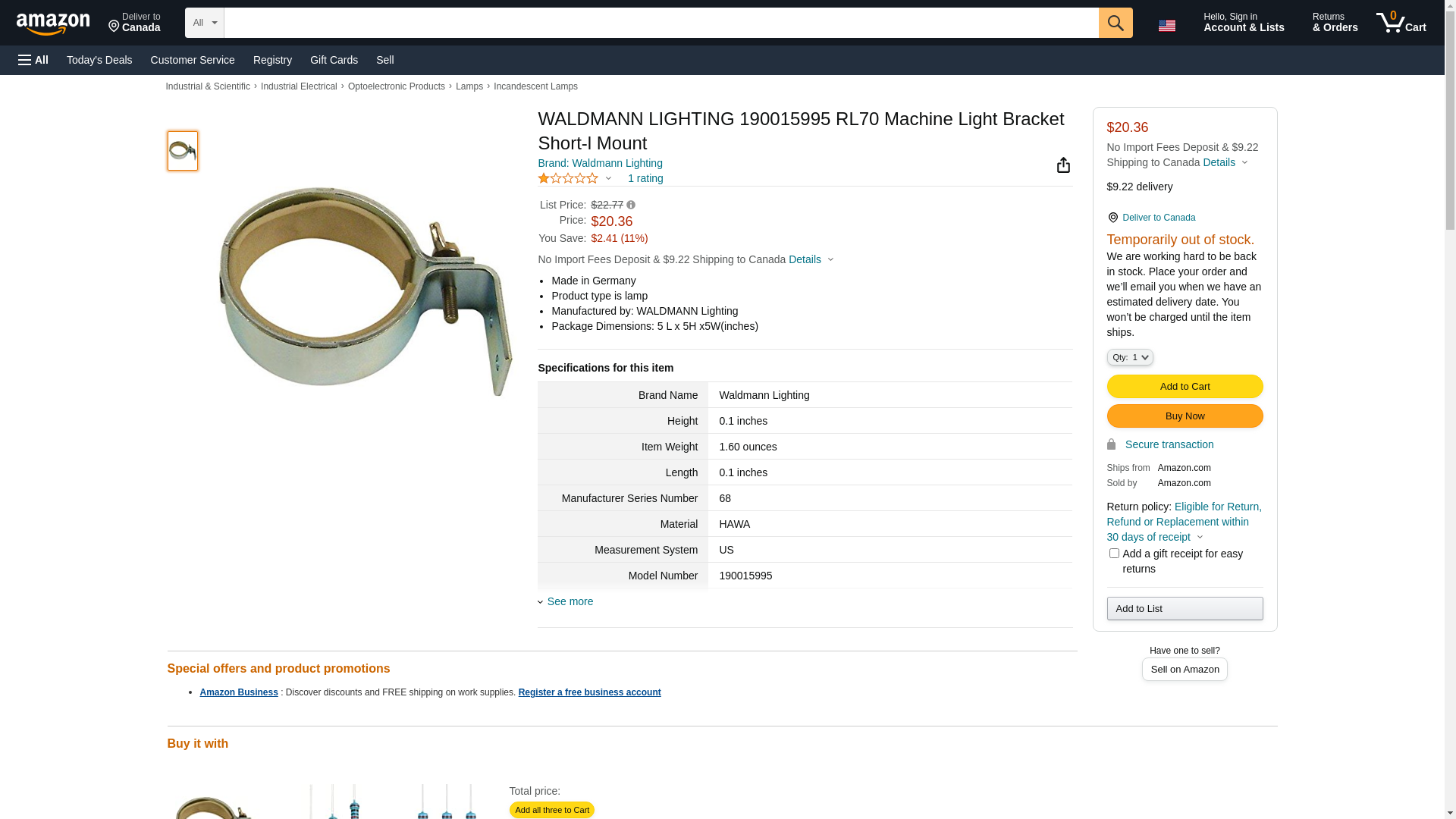 | Feature | Price For: Each Description/Special Features: Bolt Down Includes: Mounting Screws Application: Requires Two When Mounting with Waldmann Tubular Machine Tool Lights Housing Material: Metal Type: Short L Item: Tubular Light Mounting Bracket Finish: Galvanized Country of Origin (subject to change): Germany |