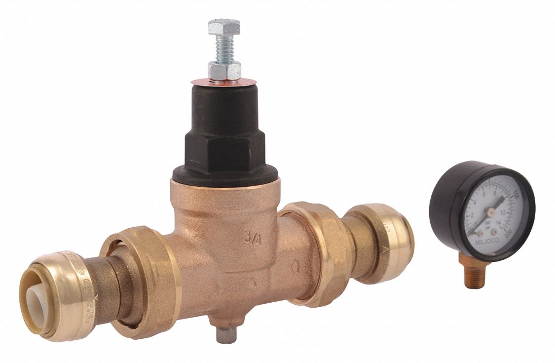 - EASY TO USE: This push-to-connect water pressure-reducing valve allows for quick and easy installation and is compatible with PEX, copper, CPVC, PE-RT, and SDR-9 HDPE pipe; double union SharkBite connection threads directly onto the valve body