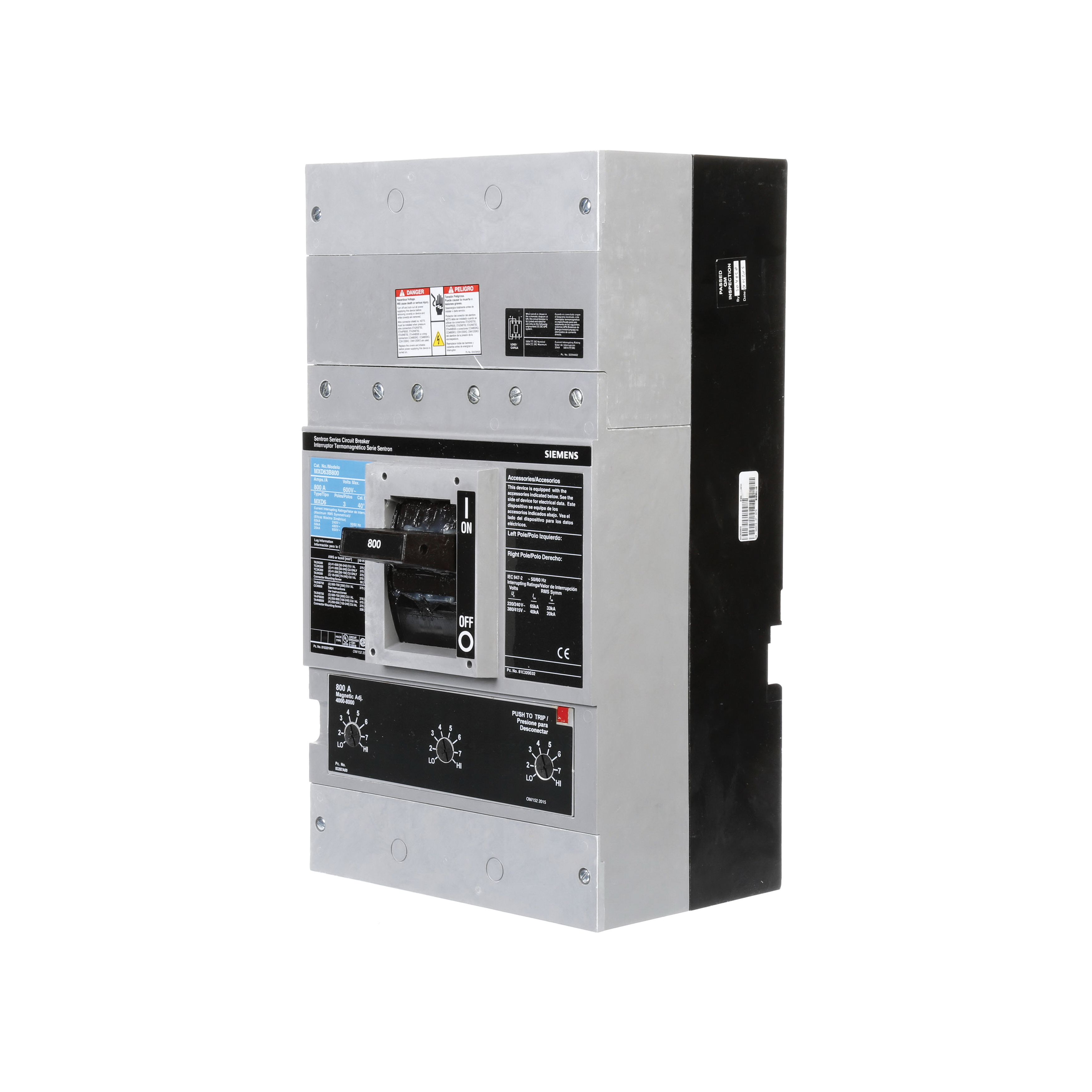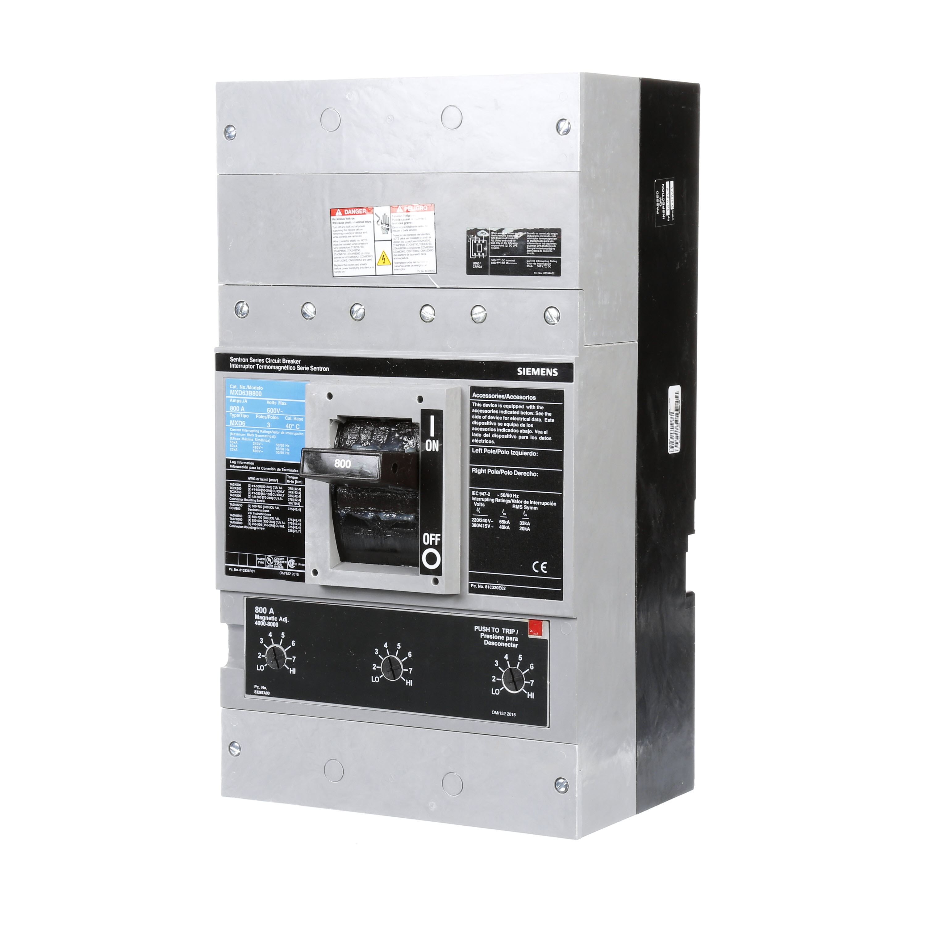 MXD63B800 Molded Case Circuit Breaker; Type Thermal Magnetic; Frame Type MD; Voltage Rating 600 Volt AC; Current Rating 800 Amp; Number of Poles 3; Interrupting Rating 65 Kiloamp at 240 Volt AC (UL 489), 50 Kiloamp at 480 Volt AC (UL 489), 25 Kiloamp at 600 Volt AC/500 Volt DC (UL 489), 65/33 Kiloamp at 220/240 Volt AC (IEC), 40/20 Kiloamp at 380/415 Volt AC (IEC); Terminal Type Lug; Size 9 Inch Width x 8.25 Inch Depth x 16 Inch Height; Approval UL 489, IEC 947-2; RoHS Compliant; Label Color Blue