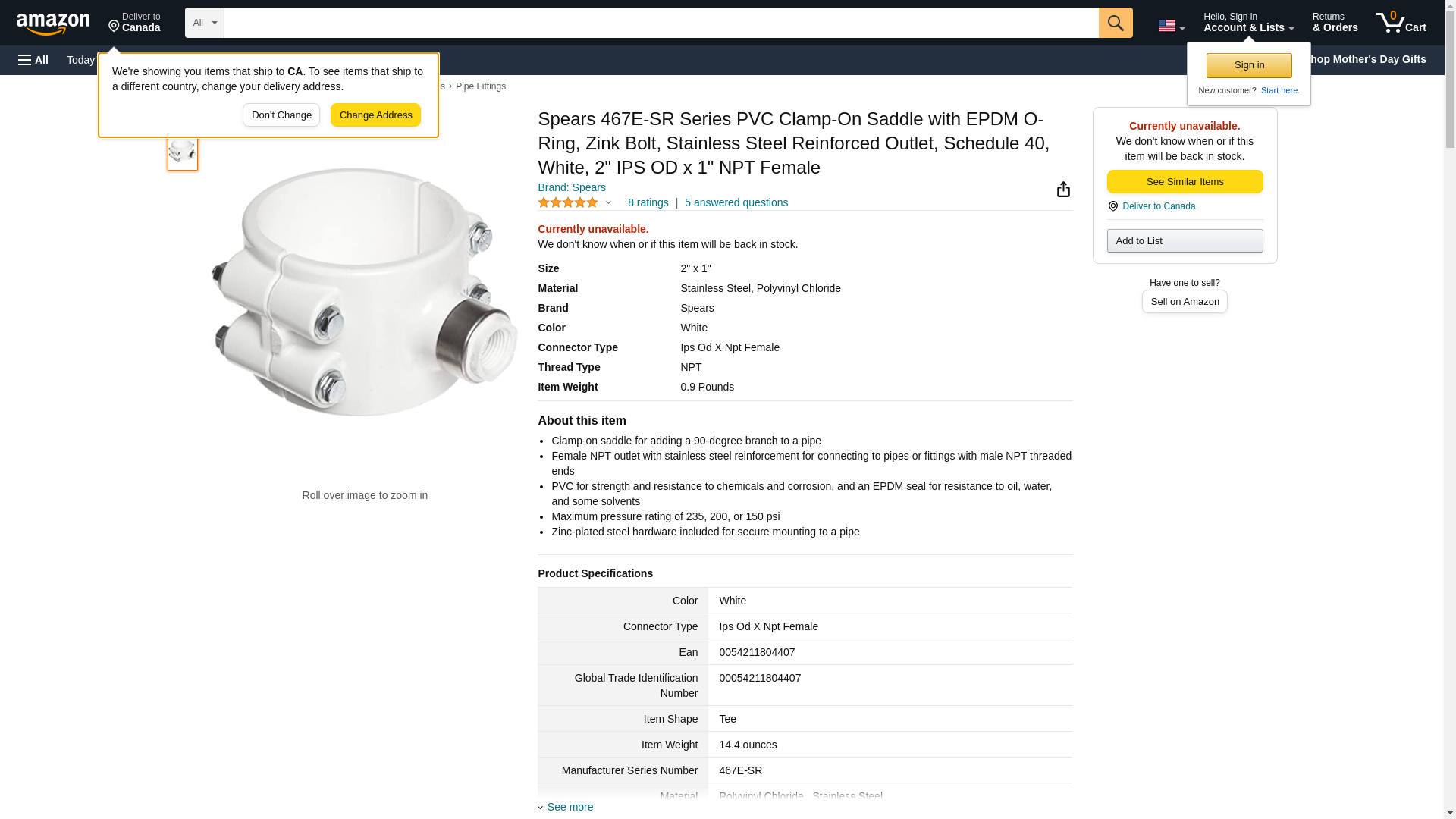 This Spears schedule 40 PVC clamp-on saddle has a female NPT threaded outlet for connecting to pipes or fittings with male NPT threaded ends, and is suitable for adding a 90-degree branch to a pipe. The stainless steel reinforcement increases the life of the outlet, and the National Pipe Taper (NPT) threads create a tighter seal than straight threads. The saddle is made of white PVC (polyvinyl chloride) for chemical and corrosion resistance, high strength, and less weight than metal. It has an EPDM (ethylene propylene diene monomer) seal for resistance to oil, water, and some solvents, and is compatible with all types of pipe with an Iron Pipe Size (IPS) outside diameter (OD). The saddle has a maximum pressure rating of 235 pounds per square inch (psi) at up to 4" IPS, 200 psi at 6" IPS, and 150 psi at 8 to 12" IPS. It comes with zinc-plated steel hardware for secure mounting to a pipe. This PVC clamp-on saddle is suitable for adding a 90-degree branch to pipes for cold-water pressure distribution systems including irrigation, pool and spa, potable water, and chilled water applications. Pipe fittings are components used for connecting, terminating, controlling flow, and changing the direction of piping in many different industries. When purchasing pipe fittings, consider the application, as this will affect material type, shape, size and required durability. Fittings are available threaded or unthreaded, in many shapes, styles, sizes, and schedules (pipe wall thickness). Spears Manufacturing produces thermoplastic fittings and valves for fluid, drain, waste, and vent systems. The company, founded in 1969 and headquartered in Sylmar, CA, meets International Organization for Standardization (ISO) standard 9001.