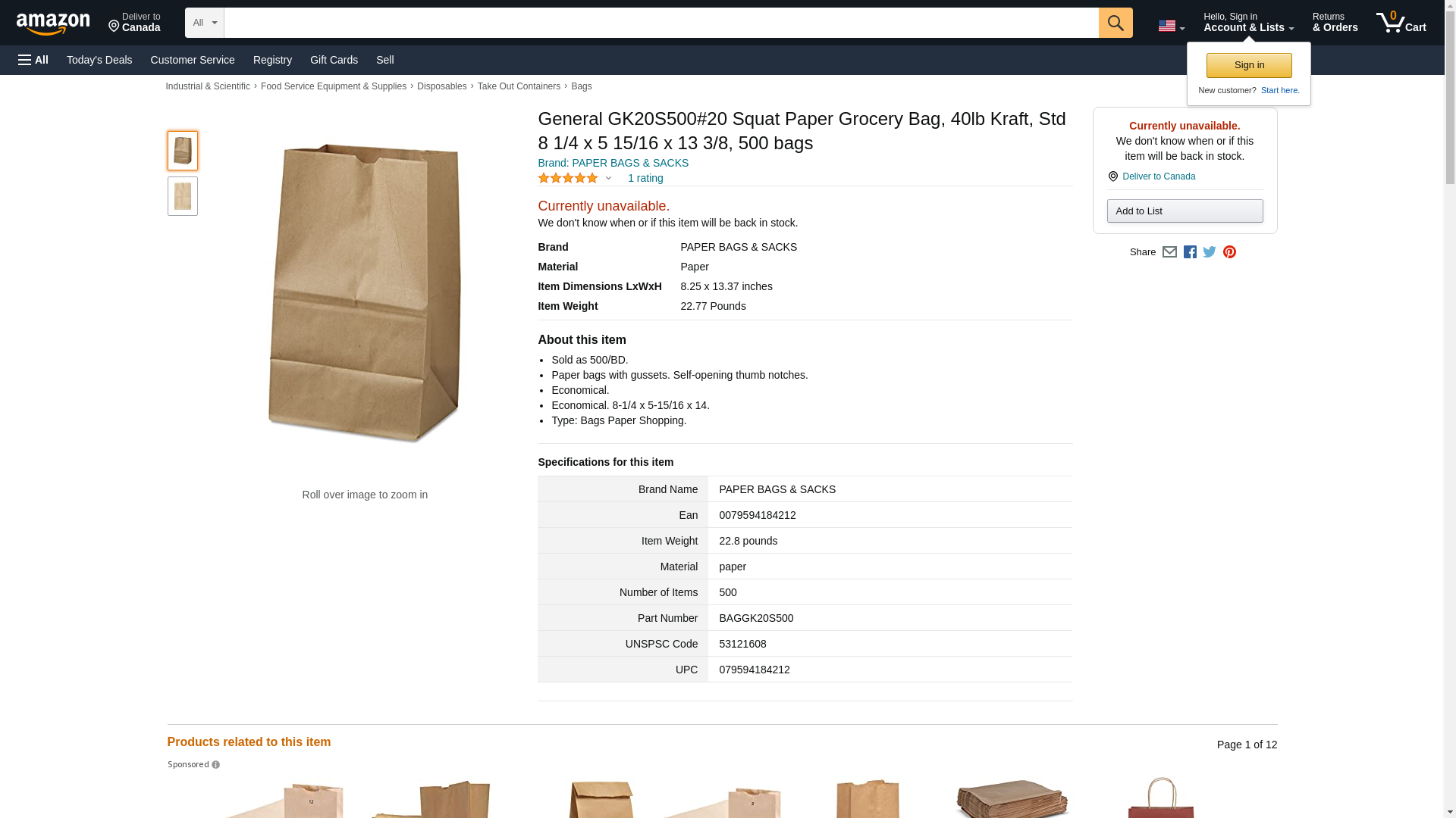 | Feature | General 20# Squat Paper Bag, 40lb Kraft, Brown, 8 1/4 x 5 15/16 x 14 3/8, 500/Pack |