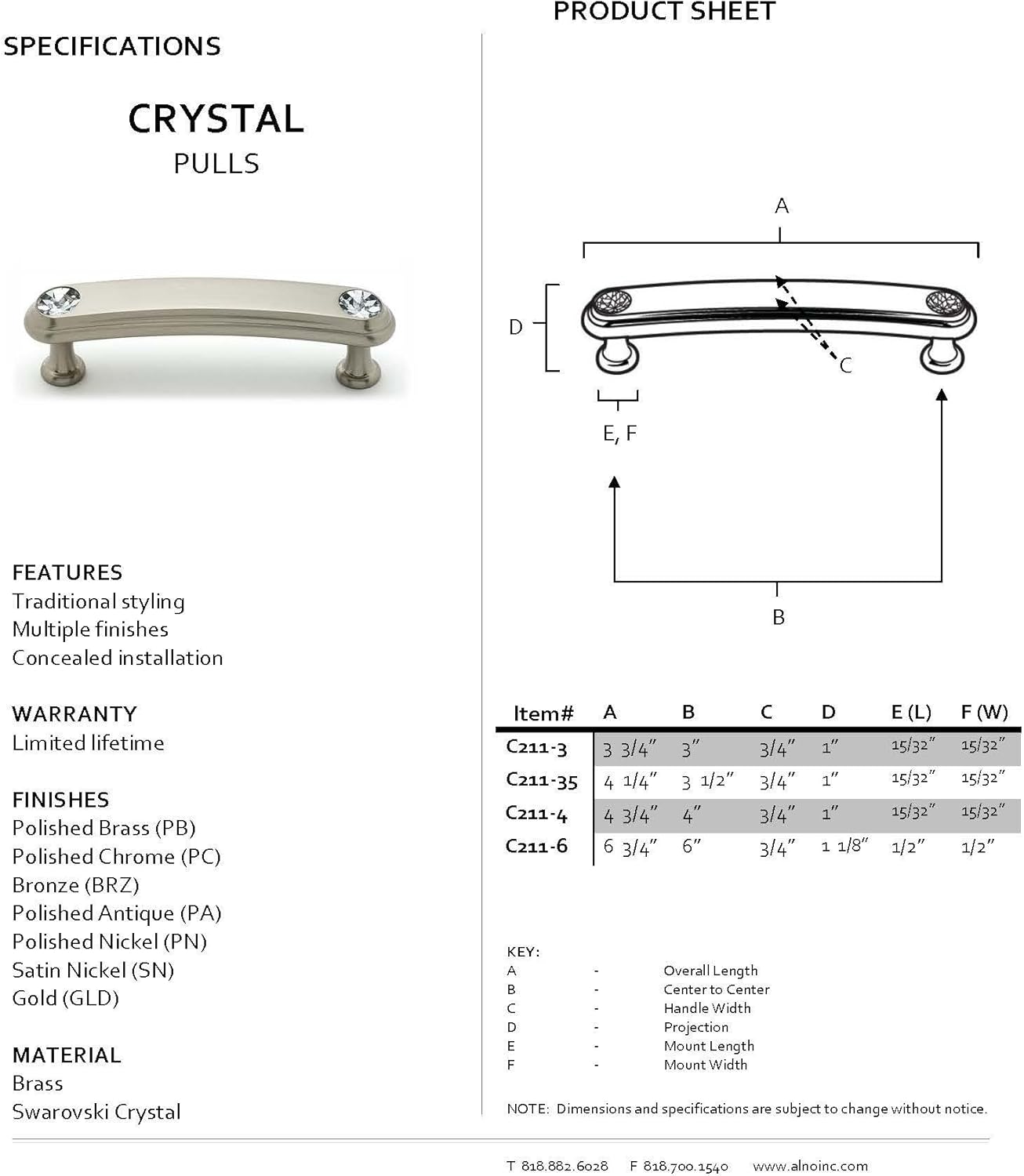 C211-6-GLD Finish: Gold, Size: 6" Features: -Pull cabinet hardware.-3": 0.75" H x 3.75" W 1" D, 0.3 lbs.-3.5": 0.75" H x 4.25" W x 1" D, 0.35 lbs.-4": 0.75" H x 4.75" W x 1" D, 0.35 lbs.-6": 0.75" H x 6.75" W x 1.125" D, 0.55 lbs. Color/Finish: -Crystal accents. Dimensions: -Base width: 0.5".