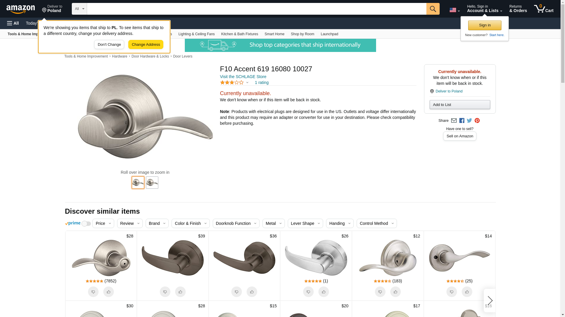 Sold as 2 UNITS at $28.42 per unit. (1 unit = each.) F-series. Adjustable latch. Reversible lever for left or right handed applications. ADA compliant. Satin nickel finish (619). Boxed. Manufacturer number: F10ACC619. SKU #: 5350632. Country of origin: Mexico. Distributed by Schlage Lock.