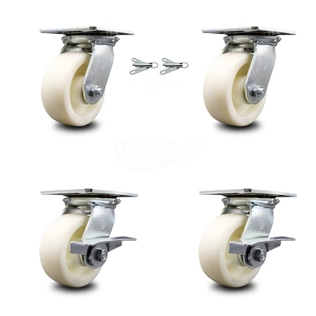 Heavy Duty Large Top Plate Nylon Swivel Caster w/Main. Free Bearings Set of 4 w/5" x 2" White Wheels-Includes 2 Swivel with Bolt on Swvl Lcks&2 Swvl with Brakes-3600lbs Total Cpty-Service Caster Brand