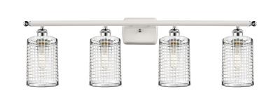 INNOVATIONS 516-4W-WPC-M18-PC Nestbrook 4 36 inch Bath Vanity Light White and Polished Chrome. Style: Industrial, Farmhouse, Restoration-Vintage. Collection Name: Downtown Urban. Metal Finish(Body): White and Polished Chrome. Metal Finish(Shade): Polished Chrome. Metal Finish(Canopy/Backplate): White. Material: Steel, Cast Brass. Dimension(in): 12(H) x 36(W) x 7(Ext). Bulb: (4)6W LED(Included). Voltage: 120. Dimmable: Yes. Color Temperature (Kelvin): 2700. Color Rendering Index (CRI): 90. Lumens: 750. Life Expectancy (Hours): 15000. Shade Shape: Cylinder. Glass or Metal Shade Color: Polished Chrome. Shade Material: Metal. Metal Shade Description: Polished Chrome Nestbrook. Shade Dimension(in): 4.75(W) x 7(H). Fitter Measurement (Glass Or Metal Shade Fitter Size): Threaded socket ring with a 1.625 inch opening. ADA Compliant: No. California Proposition 65 Warning Required: Yes. UL/ETL Certification Type: Damp Location.