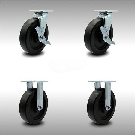 Stainless Steel Polyolefin Swivel Top Plate Caster Set of 4 w/8" x 2" Black Wheels - Includes 2 Swivel with Brakes & 2 Rigid - 3600 lbs Total Capacity - Service Caster Brand