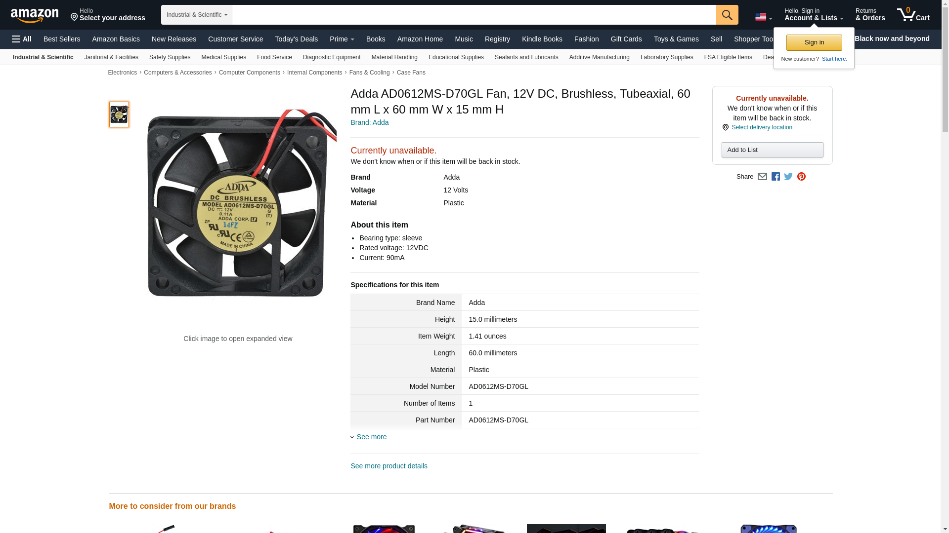 Adda AD0612MS-D70GL Fan, 12V DC, Brushless, Tubeaxial, 60 mm L x 60 mm W x 15 mm H