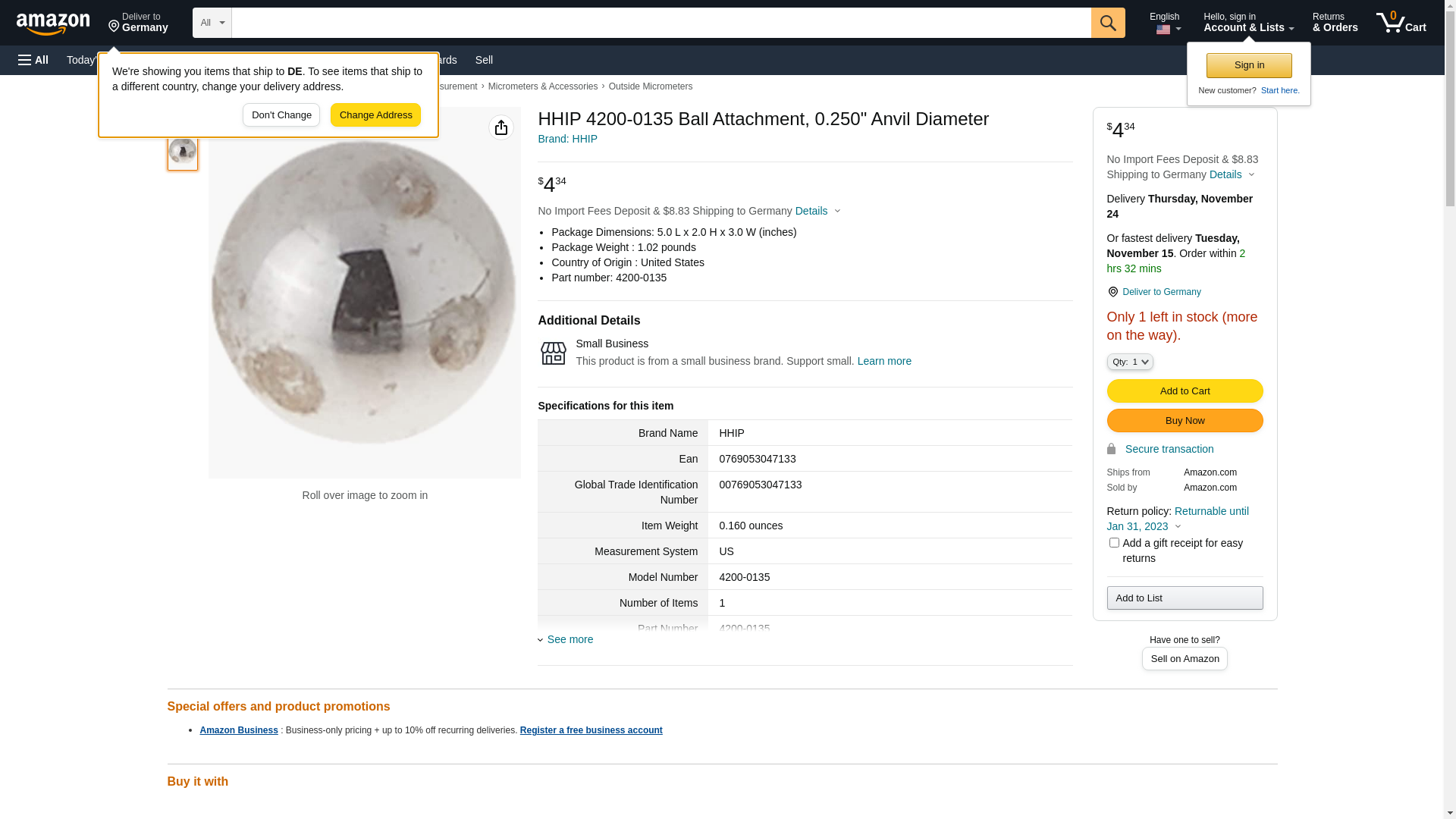 HHIP 4200-0135 5mm (1.969") Anvil Diameter Ball Attachment for Micrometers
