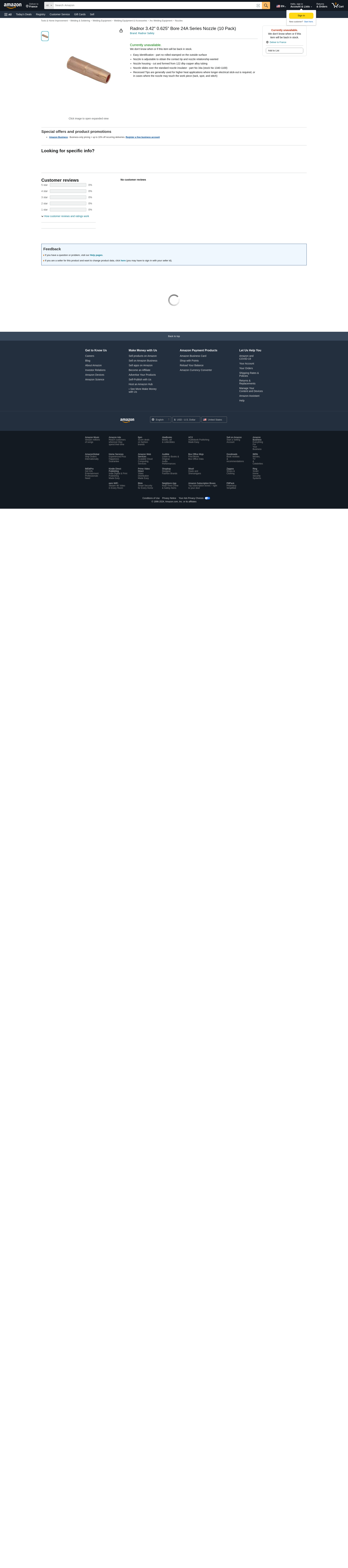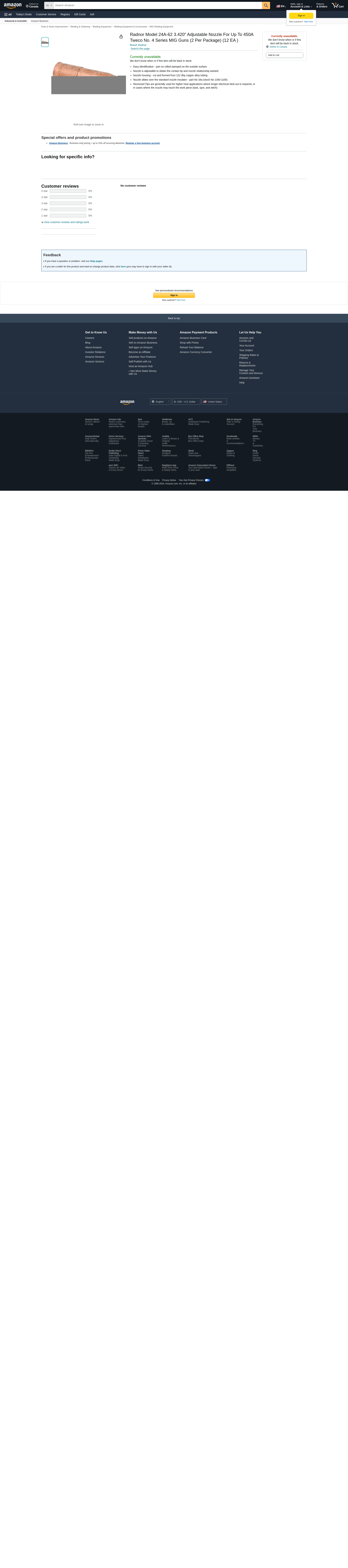 | Feature | Price For: Each Style: Tweco For MIG Guns: Radnor(R), Tweco(R), Tweco(R) No. 4 Material: Copper Item: Nozzle Bore Dia. (In.): 5/8 Series: 24A62 Type: Adjustable Country of Origin (subject to change): China |