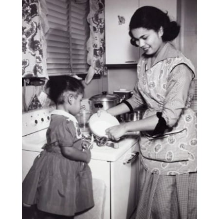 Stretched Canvas Art - Mother and her daughter washing kitchen utensils - Large 24 x 36 inch Wall Art Decor Size.