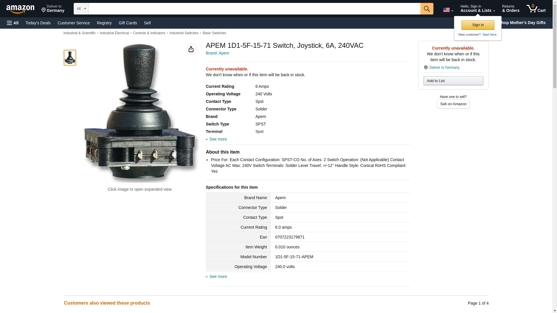 APEM 1D1-5F-15-71 Switch, Joystick, 6A, 240VAC