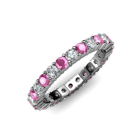 <ul> <li>2.05 ct tw to 2.46 ct tw Round Diamond & Round Pink Sapphire Common Prong Eternity Band in 18K Gold.</li> <li>VS2-SI1-Clarity, F-G-Color Diamond & SI2-I1-Clarity, Pink-Color Pink Sapphire.</li> <li>Gemstones may have been Treated to Improve their Appearance or Durability & may Require Special Care.</li> <li>The Natural Properties & Composition of Mined Gemstones define the Unique Beauty of each Piece. The Image may show Slight Differences to the Actual Stone in Color & Texture.</li> <li>All our Diamonds to our Best Knowledge are not Conflict Diamonds.</li> </ul>