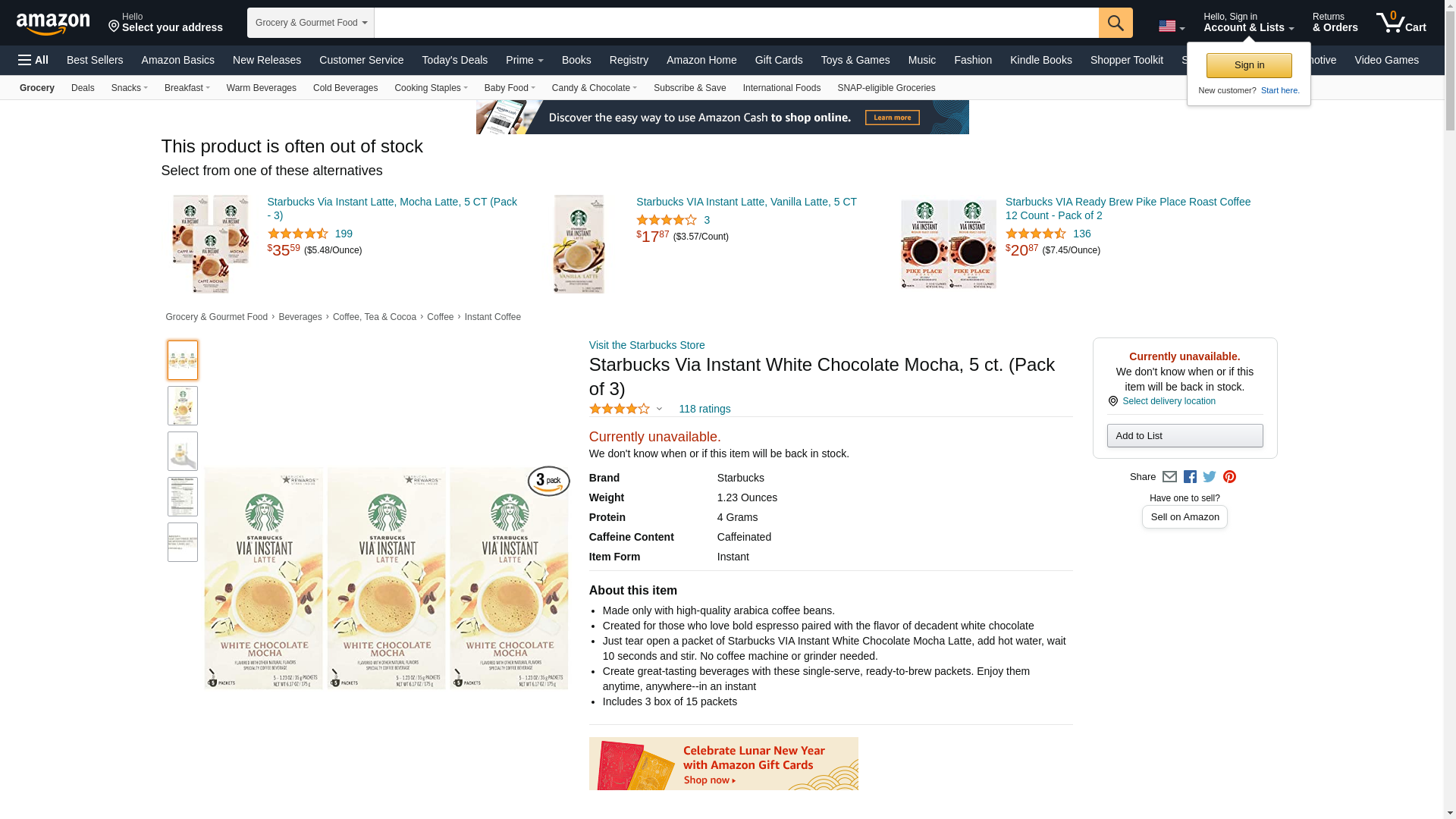 Starbucks Via Instant White Chocolate Mocha (3 Boxes 15-1.23oz Packets): Maxedbuy.com