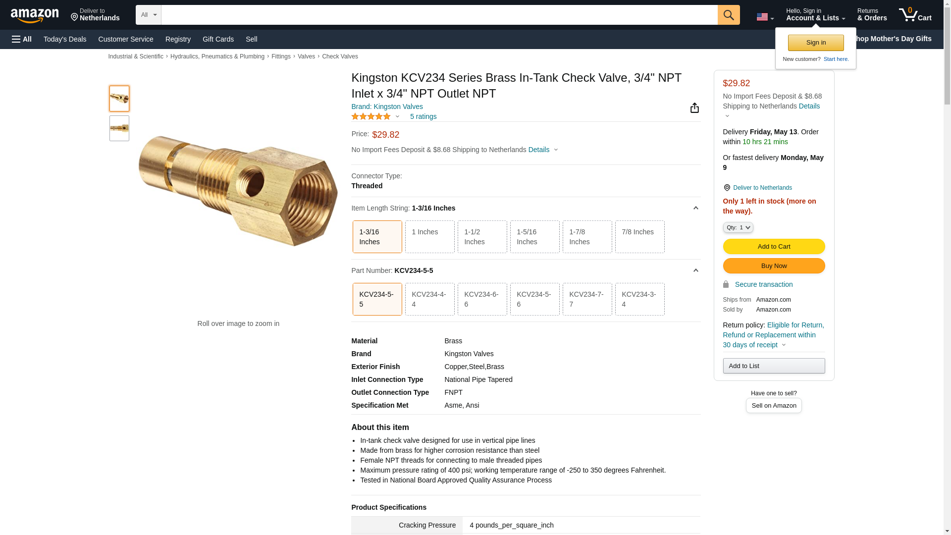 Kingston KCV234 Series Brass In-Tank Check Valve, 3/4" NPT Inlet x 3/4" NPT Outlet NPT
