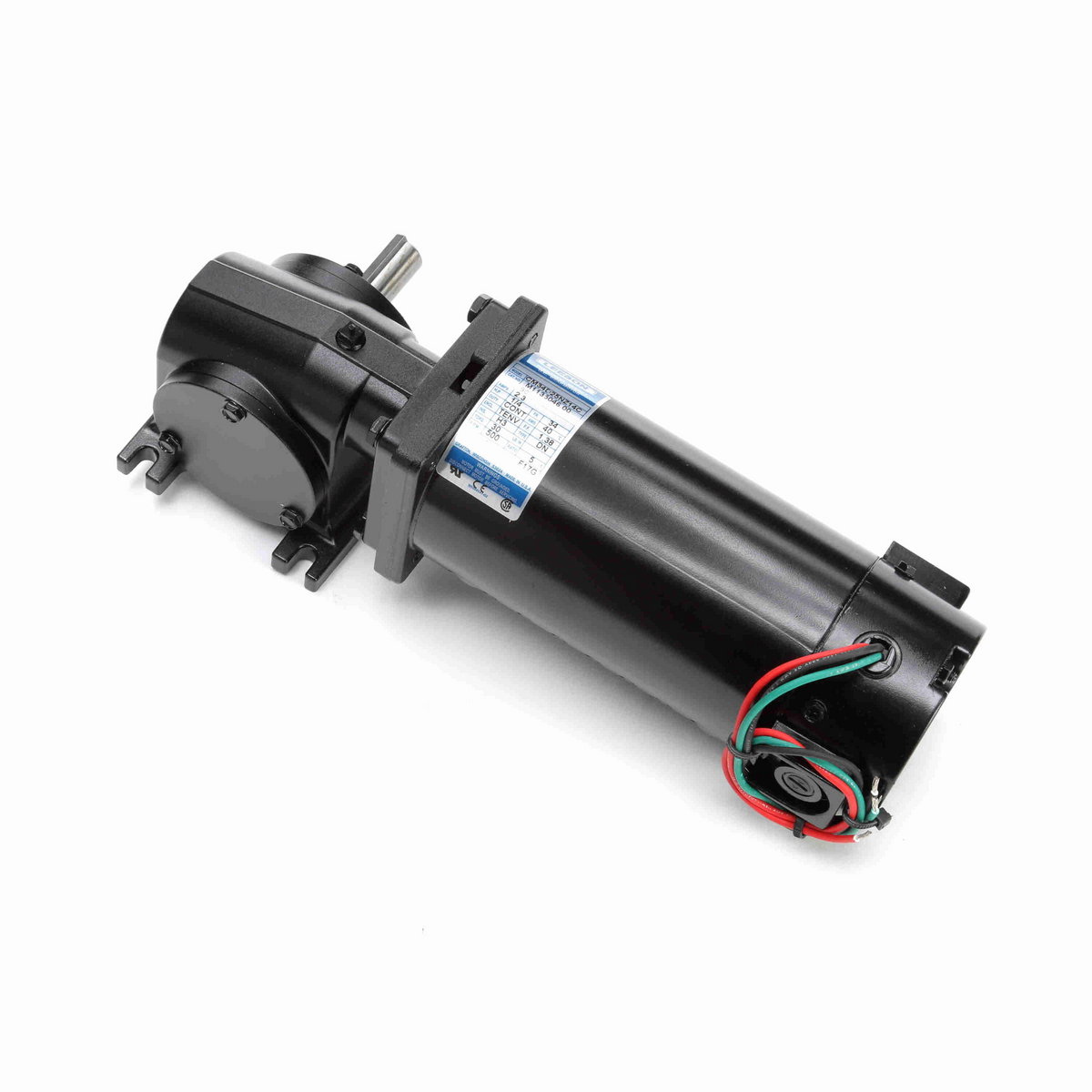 <p><ul><li>Worm-type right-angle gearing features hardened, steel worm with bronze worm wheel for long life and quiet operation</li><li>Precision machined aluminum gear housing</li><li>Lubrication is permanent with an oil bath</li><li>Gearbox has all ball bearings</li><li>Output shaft is field interchangeable from left hand to right hand style by reassembly</li><li>Double output shaft available as a factory option</li><li>Optional conduit box available</li><li>Optional gearbox base available (10 Series only)</li></ul></p><p><b>Specifications: </b><ul><li>Motor Type:-Brushed</li><li>Shaft Type:-Right Angle</li><li>kW:-0.19 kW</li><li>Input Horsepower:-1/4 hp</li><li>Motor Supply Voltage:-90 V</li><li>Gear Ratio:-5 :1</li><li>Output rpm:-500.0 rpm</li><li>Full Load Torque:-30 in-lbs</li><li>Full Load Current:-2.30 A</li><li>Frame Size:-34</li><li>Enclosure Type:-TENV (Totally Enclosed Non-Ventilated)</li><li>Mounting Type:-Special</li><li>Insulation Class:-H</li><li>Thermal Protection:-None</li><li>Standards Met:-CE,UL Recognized,CSA</li><li>Service Factor:-1.00</li><li>Duty / Condition Type:-Continuous Duty</li><li>Motor Length Less Shaft:-5.81 in</li><li>Overall Length (C-Dimension):-12.64 in</li><li>Drive End Bearing Size:-6201-13</li><li>Opposite Drive End Bearing Size:-6201-13</li><li>Shaft Diameter:-0.63 in</li><li>Shaft Rotation:-Reconn</li><li>Ambient Temperature Range:-40 C</li><li>Weight:-16 lbs</li></ul></p>