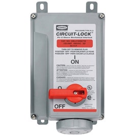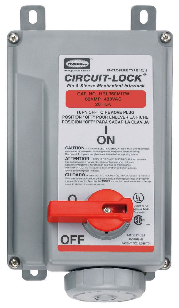 'Circuit Lock Unfused Mechanical Interlock, Current Rating 100 Amps, Voltage Rating 480 Volts, Power Rating 50 HP, Phase Three, Number of Poles 3, Number of Wires 4, Accepts Plug 5Z926, Nonmetallic Enclosure'
