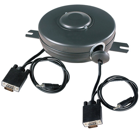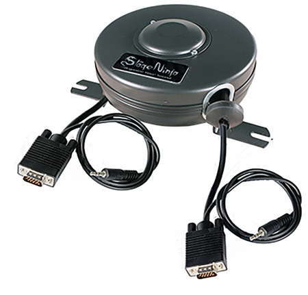 Stage Ninja <b>VGA-15-A</b> Premium VGA cable with 15-pin connectors & audio cable with 1/8 inch male connectors. Pull cable to desired length (it locks in place); give the cable another pull to unlock. Cable instantly retracts into protective housing. The durable powder coated steel housing comes standard with a flat mounting strap that can be fastened to a horizontal surface like a cabinet, or rack mount. A vertical mounting bracket kit is available. The static end is 3 feet. Constant tension is available upon request. Eliminates cord winding, cord tangles and stage/workspace clutter with instant cable retraction.</p>