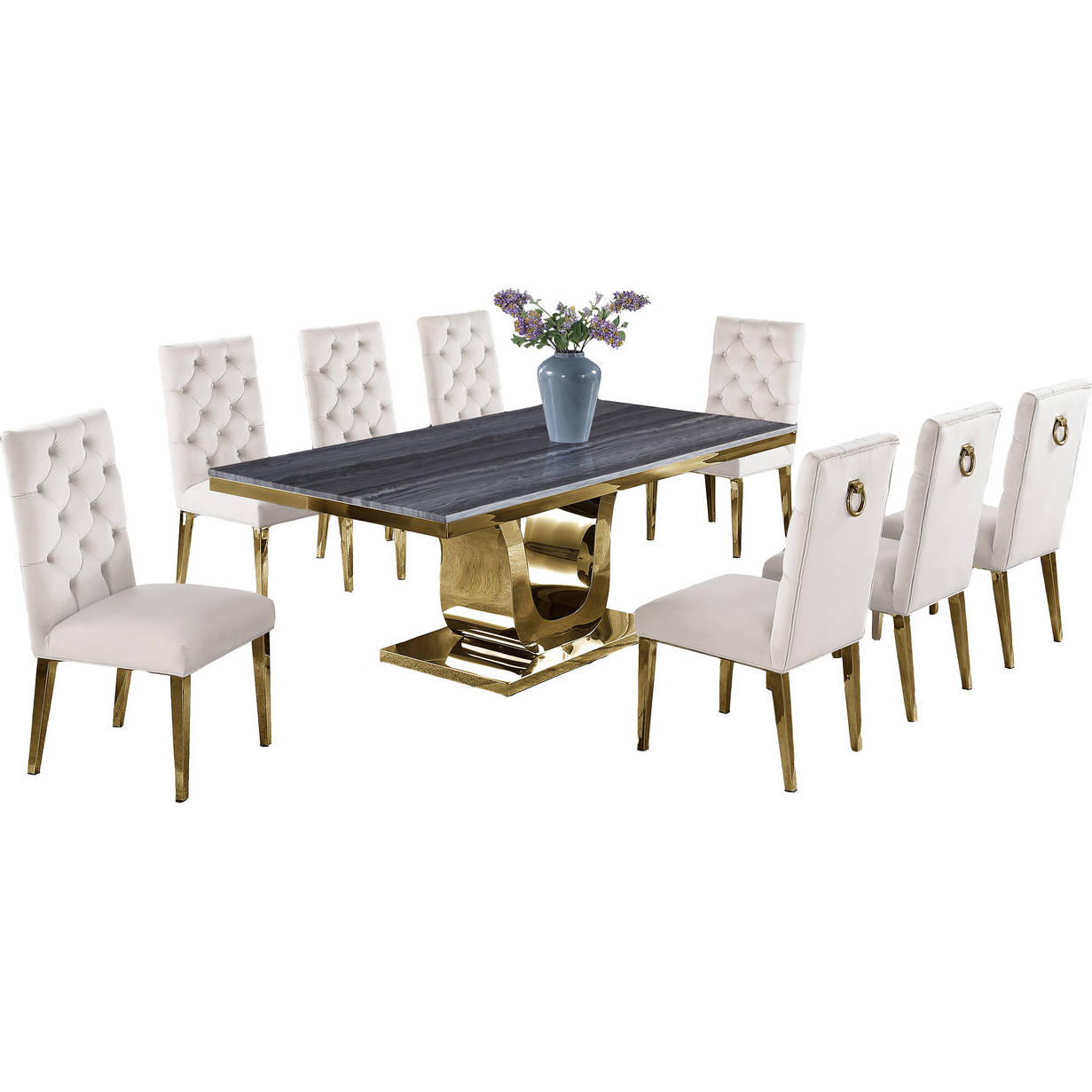 Best Quality D12-8SC76 D12 9 Piece Dining Set in Gray Marble, Gold Stainless & Cream Velvet
