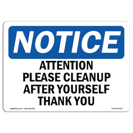 OSHA Notice Sign, Attention Please Cleanup After Yourself Thank You, 24in X 18in Rigid Plastic