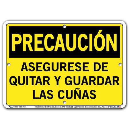 Vestil SI-C-69-A-PS-040-S Sign-Caution-69 10.5X7.5 Polystyrene.040, Make Sure That Wheel CHOCKS are Removed and STOWED, ASEGURESE DE QUITAR Y GUARDAR LAS CUÑAS