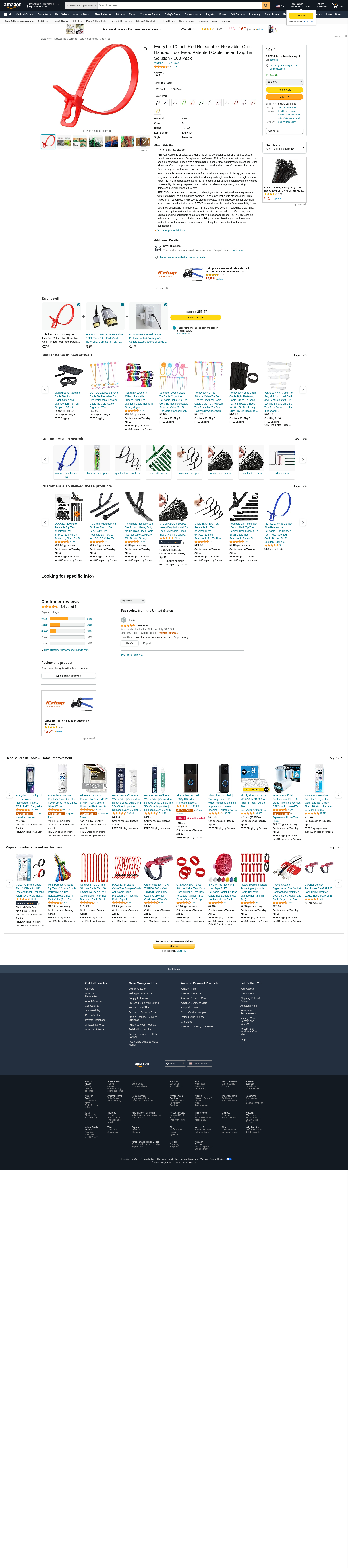 RETYZ EveryTie 10 Inch Red Releasable, Reusable, One-Handed, Tool-Free, Patented Cable Tie and Zip Tie Solution - 100 Pack