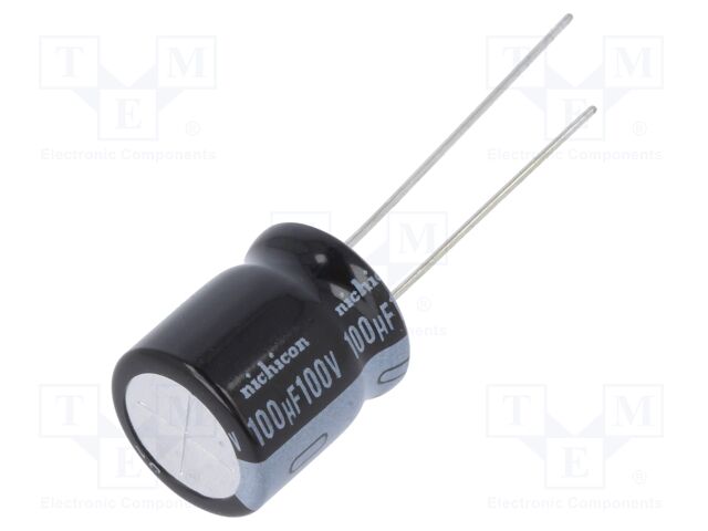 | Feature | Manufacturer: Nichicon Product Category: Radial Aluminum Electrolytic Capacitors RoHS: Capacitance: 100 uF Voltage Rating DC: 100 V Tolerance: 20 % Ripple Current: 265 mA Maximum Operating Temperature: + 105 C Load Life: 1000 h Termination Style: Radial Case Diameter: 12.5 mm Case Length: 15 mm Lead Spacing: 5 mm Product: High Temp Electrolytic Capacitors Brand: Nichicon |
