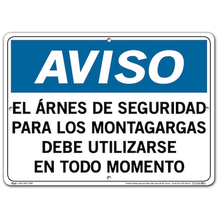 Vestil Notice SignSI-N-52-C-PS-040-S 52 14.5X10.5 POLYSTYRENE.040 Forklift Safety Harness Must Be Used At All Times EL ÁRNES DE SEGURIDAD PARA LOS MONTAGARGAS DEBE UTILIZARSE EN TODO MOMENTO