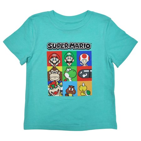 <ul> <li>Super Mario Bros toddlers boys t-shirt in teal color.</li> <li>Featuring a squares style graphic print of video game characters Super Mario, Luigi, Donkey Kong, Toad, Bowser, Yoshi and more on front</li> <li>Crew-neck, Short Sleeves. Tag-less Collar.</li> <li>60% cotton, 40% polyester. Soft and lightweight fabric.</li> <li>Officially licensed Nintendo children's merchandise!</li> <li>Kids toddler boys sizing.</li> </ul>